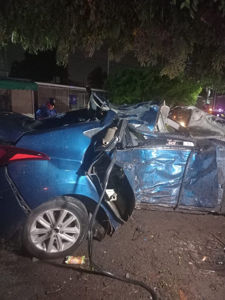 Producto del fuerte impacto el cuerpo del fallecido quedó prensado entre la chatarra retorcida del carro, así mismo el vidrio delantero terminó incrustado entre las ramas del árbol y las demás piezas del vehículo tiradas a pocos metros de donde sucedió el accidente.